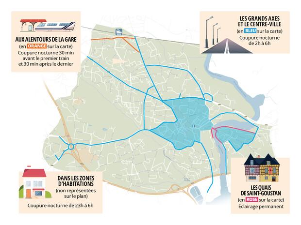 - Grands axes et centre-ville : coupure nocturne entre 2h et 6h du matin ; le centre-ville gagnera ainsi 1h d’éclairage par rapport au schéma actuel;